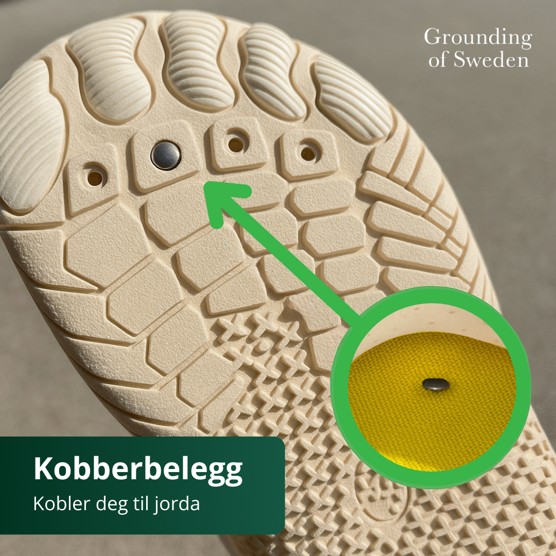 Våre jordingssko har kobberelementer i sålen som skaper en direkte kanal for elektronoverføring mellom jorda og kroppen din – og etterligner den naturlige forbindelsen du får når du går barbeint.